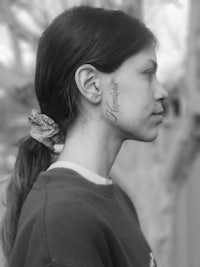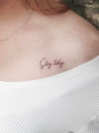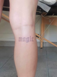 To minimize the spread of black pigment (often seen years later when writing is tattooed too small and dark) I utilize varying degrees of finer needles and/or softer black for intricate details and text. This may reduce incoherent or thick lines forming in the future. Black used if applicable.